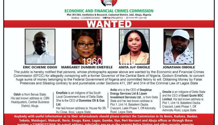 “Emefiele, Odoh, Mr and Mrs Omoile, wanted by the EFCC. The quartet of Eric Odoh, Margaret Emefiele, Anita Omoile and Jonathan Omoile, are wanted by the EFCC for offences bothering on economic and financial crimes. Any information on their whereabout? Please contact the nearest EFCC Command or the nearest police Station,” read the statement attached to the mugshot.