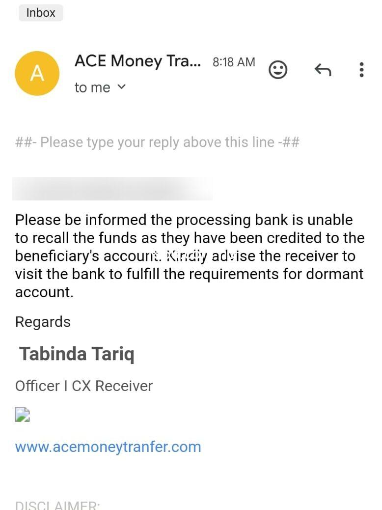 Email from the originating bank to Onireke’s inlaws
