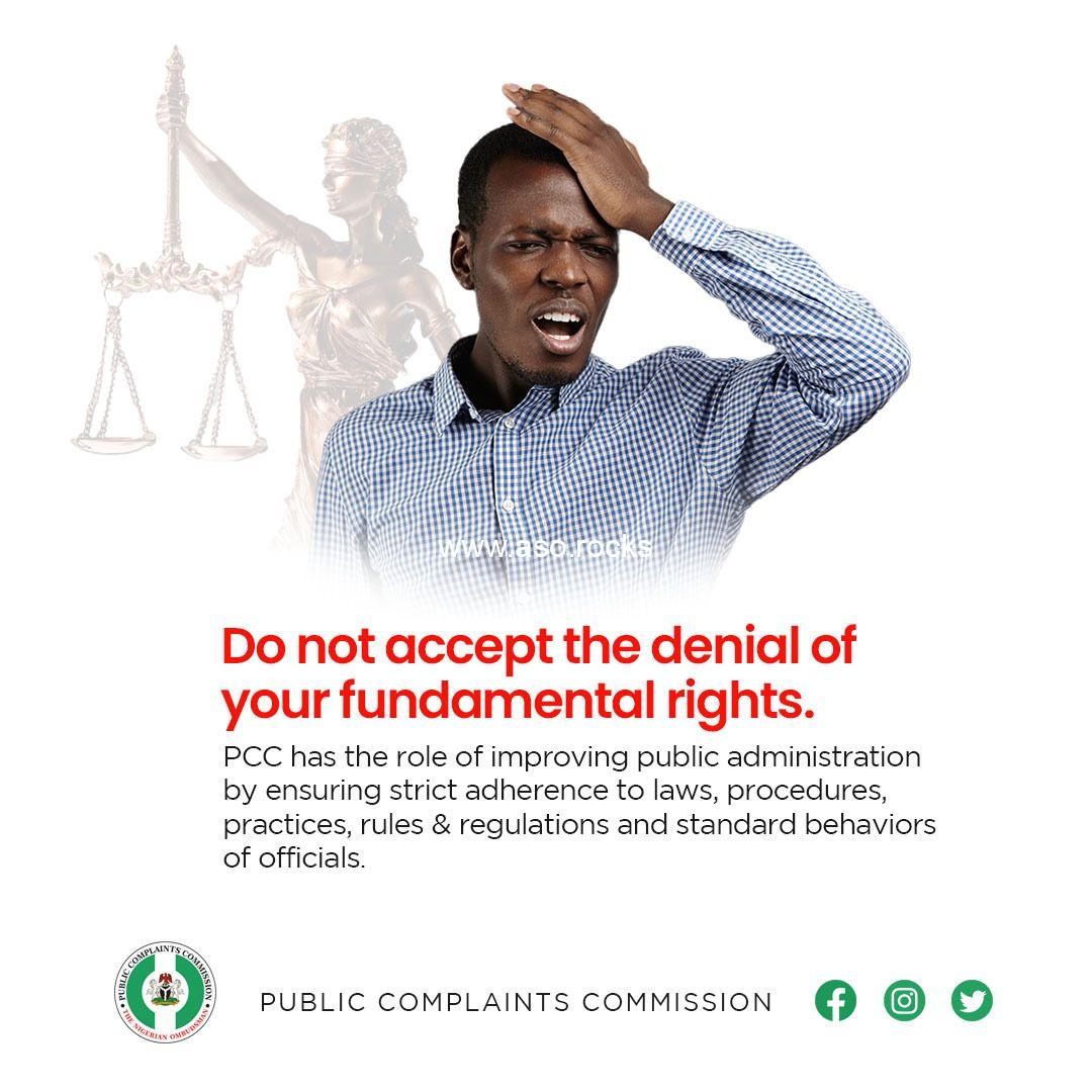 “The complaint must in addition, include the name and address of the complainant; name and address of the person or institution complained against (respondent); telephone numbers of both the complainant and the respondent if available; the complaint and supporting documents must be in duplicate (two copies) and the complaint must be duly signed by the complainant”, the PCC Commissioner added.